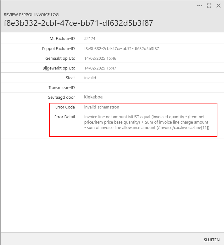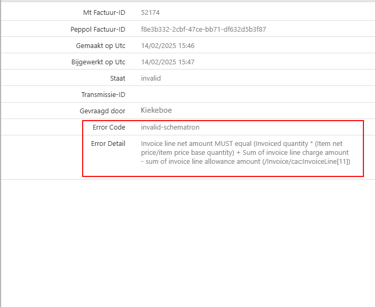 Als u op de detailregel klikt, krijgt u een overzicht van de factuur. Hier kan u de details van de fout zien.