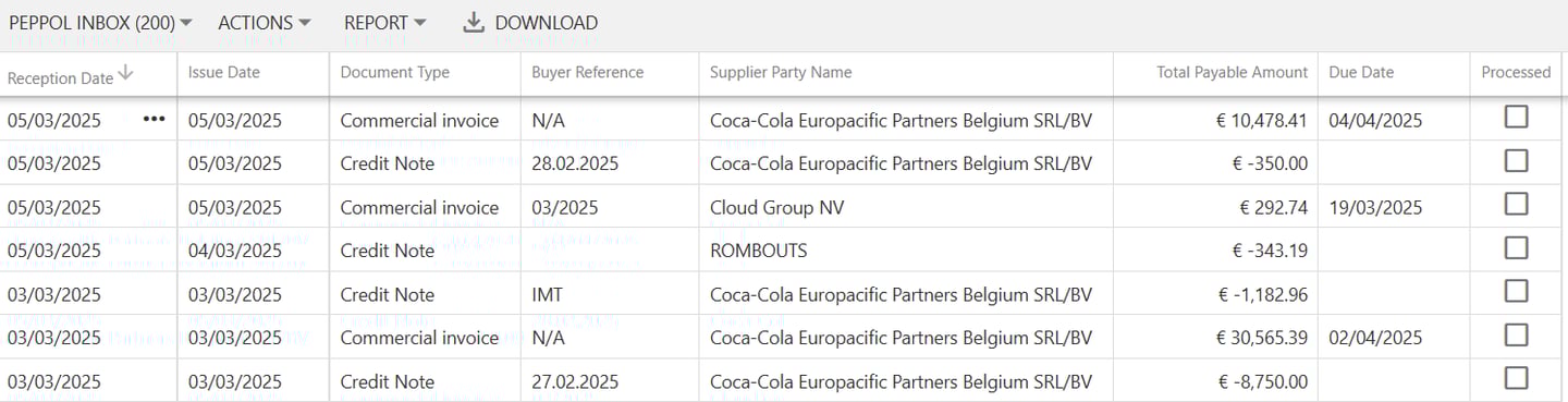 Na het maken van de connectie met het Peppol netwerk, zullen de online facturen automatisch binnenstromen. Deze facturen zijn te vinden in het Peppol menu, onder de optie 'Peppol Inbox'.