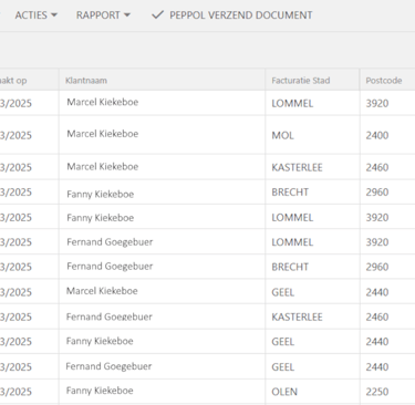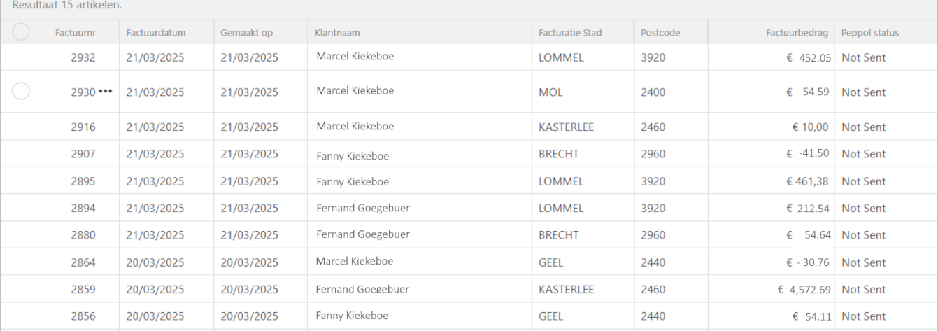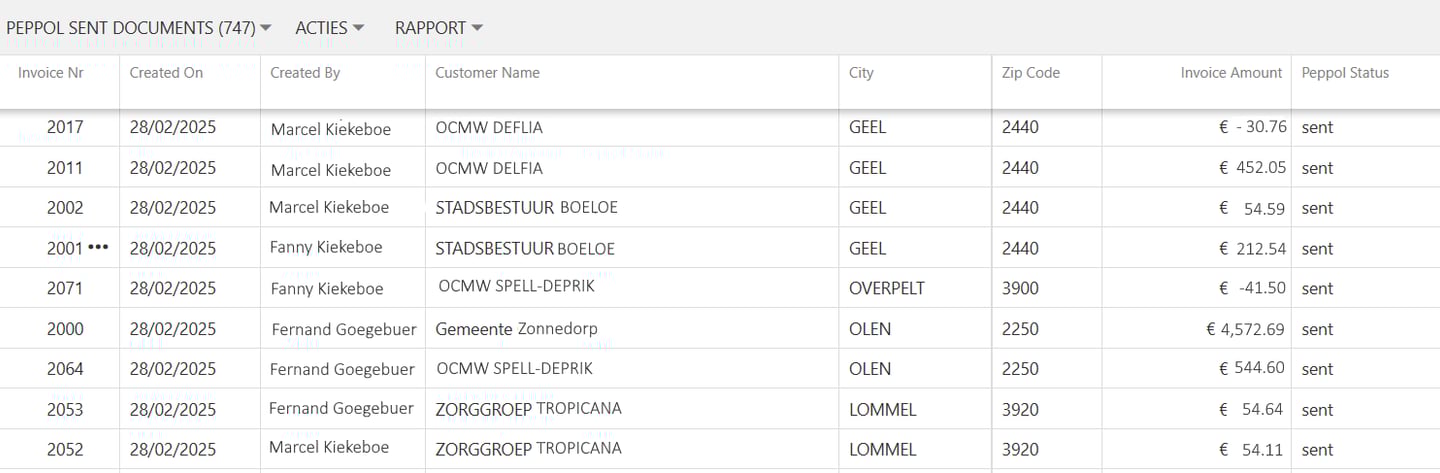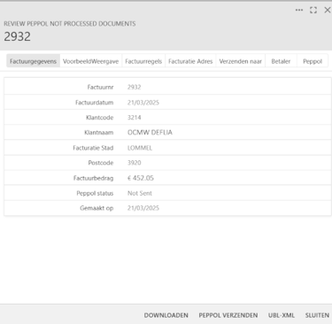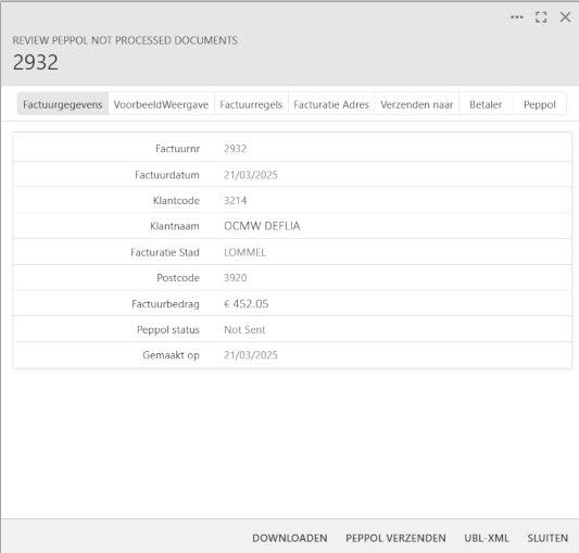 In het overzicht scherm krijgt u een duidelijk overzicht van de te verzenden documenten, inclusief de factuurdatum, de klantnaam, het factuurbedrag en de Peppol status.