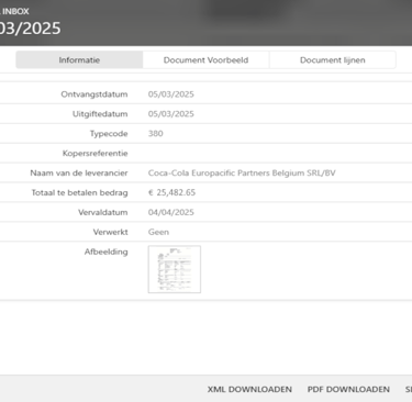 Als u op een lijn klikt in het overzicht, krijgt u een detail scherm te zien met alle details van de factuur. U kunt de factuur bekijken door op de foto te klikken of naar de tab 'Document Voorbeeld' te gaan. Als u de factuur liever in PDF- of XML-formaat bekijkt, kunt u deze downloaden naar uw computer.