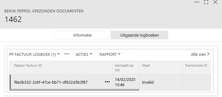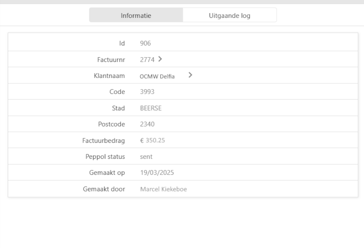 Als u op de regel van de verzonden factuur klikt en vervolgens op 'Uitgaande log', vindt u de details van de verzending richting Peppol.